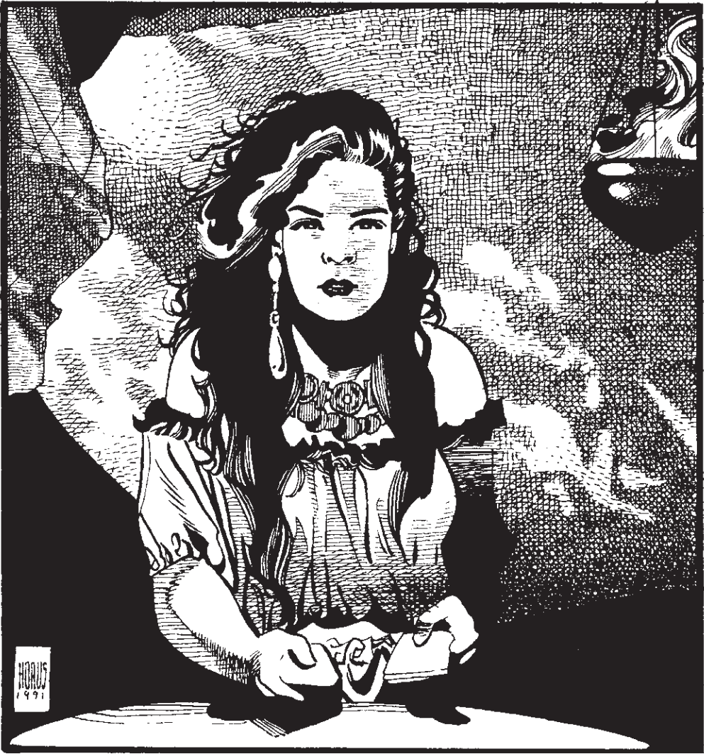 Die Helden begegneten ihr am aventurischen Gauklertreffen im Jahr 1009 BF in Khunchom, wo sie Taufiq ben Bakshir die Karten legte.